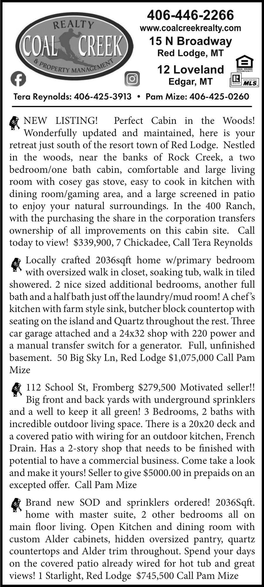 Oct 02, 2025. Coal Creek Realty & Property Management Real Estate Ads from The Carbon County News