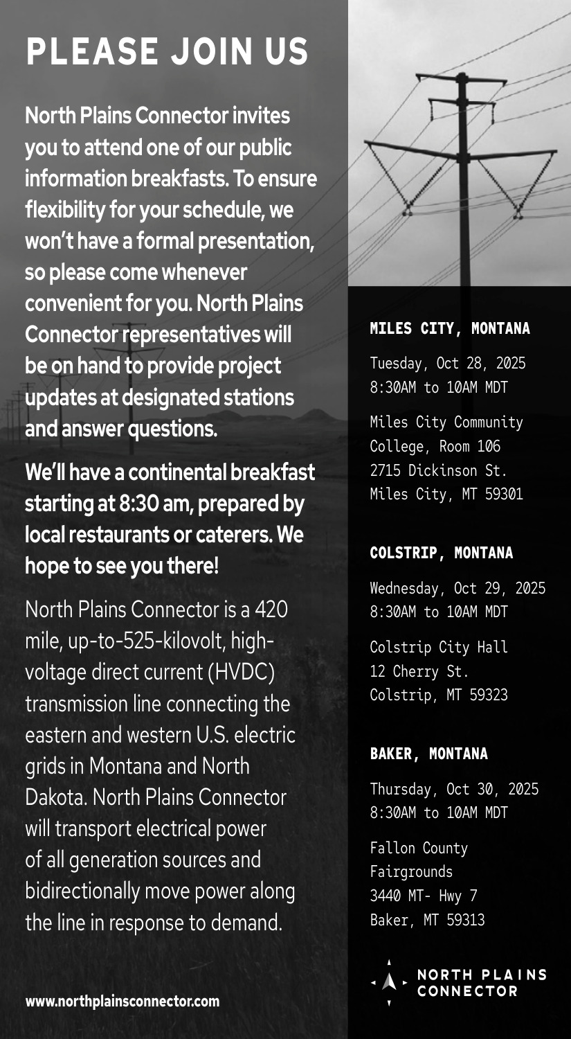 Oct 14, 2025. North Plains Connector Public Information Breakfasts (October 28,29 & 30, 2025) Events Ads from The Miles City Star