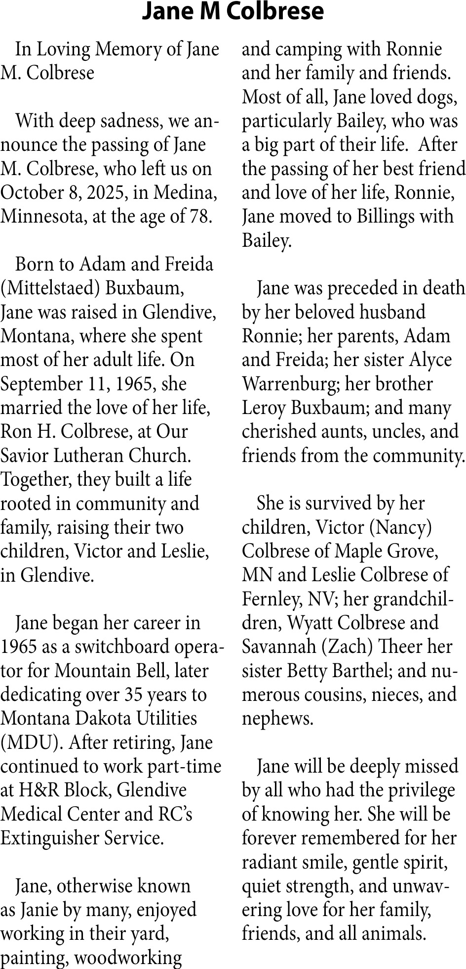 • Obituary in Glendive, MT