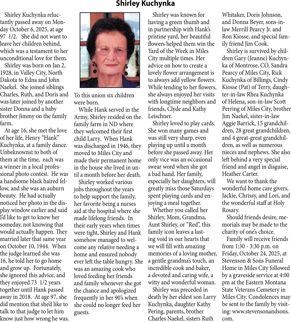 Oct 22, 2025. Obituaries Obituaries Ads from The Miles City Star