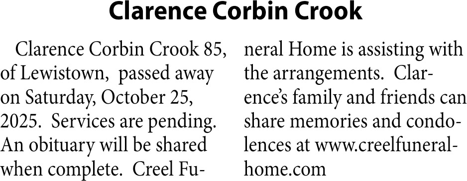 Oct 29, 2025. The Family of Clarence Corbin Crook Obituaries Ads from Lewistown News-Argus