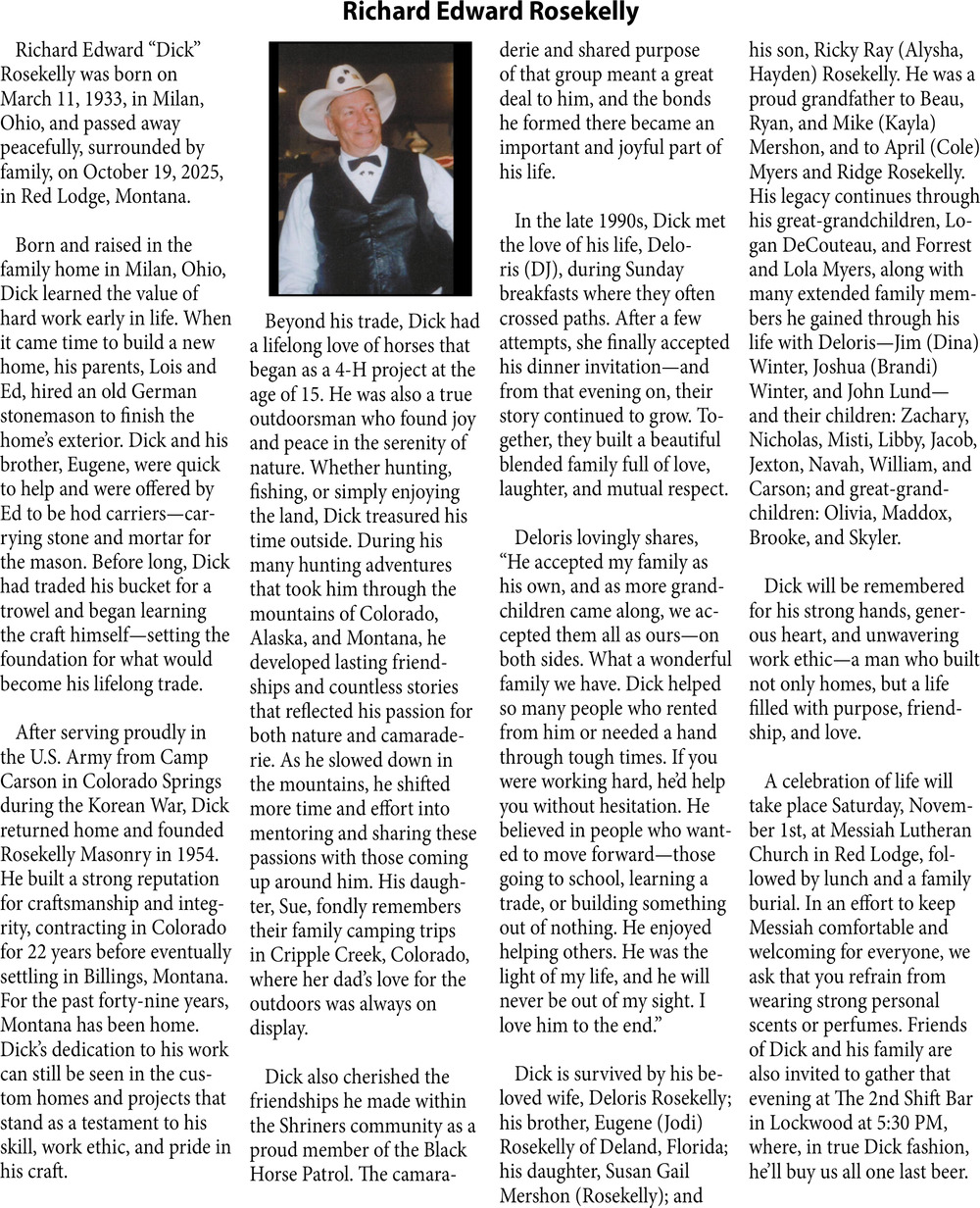 Oct 30, 2025. The Family of Richard Edward Rosekelly Obituaries Ads from The Carbon County News