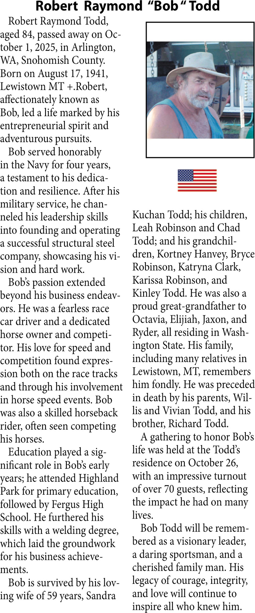 Nov 01, 2025. The Family of Robert Raymond "Bob" Todd Obituaries Ads from Lewistown News-Argus