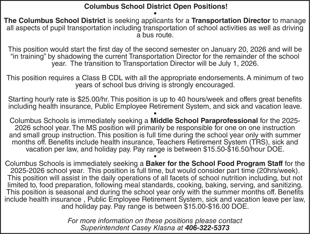 Nov 20, 2025. Columbus School District - Casey Klasna Jobs Ads from The Stillwater County News