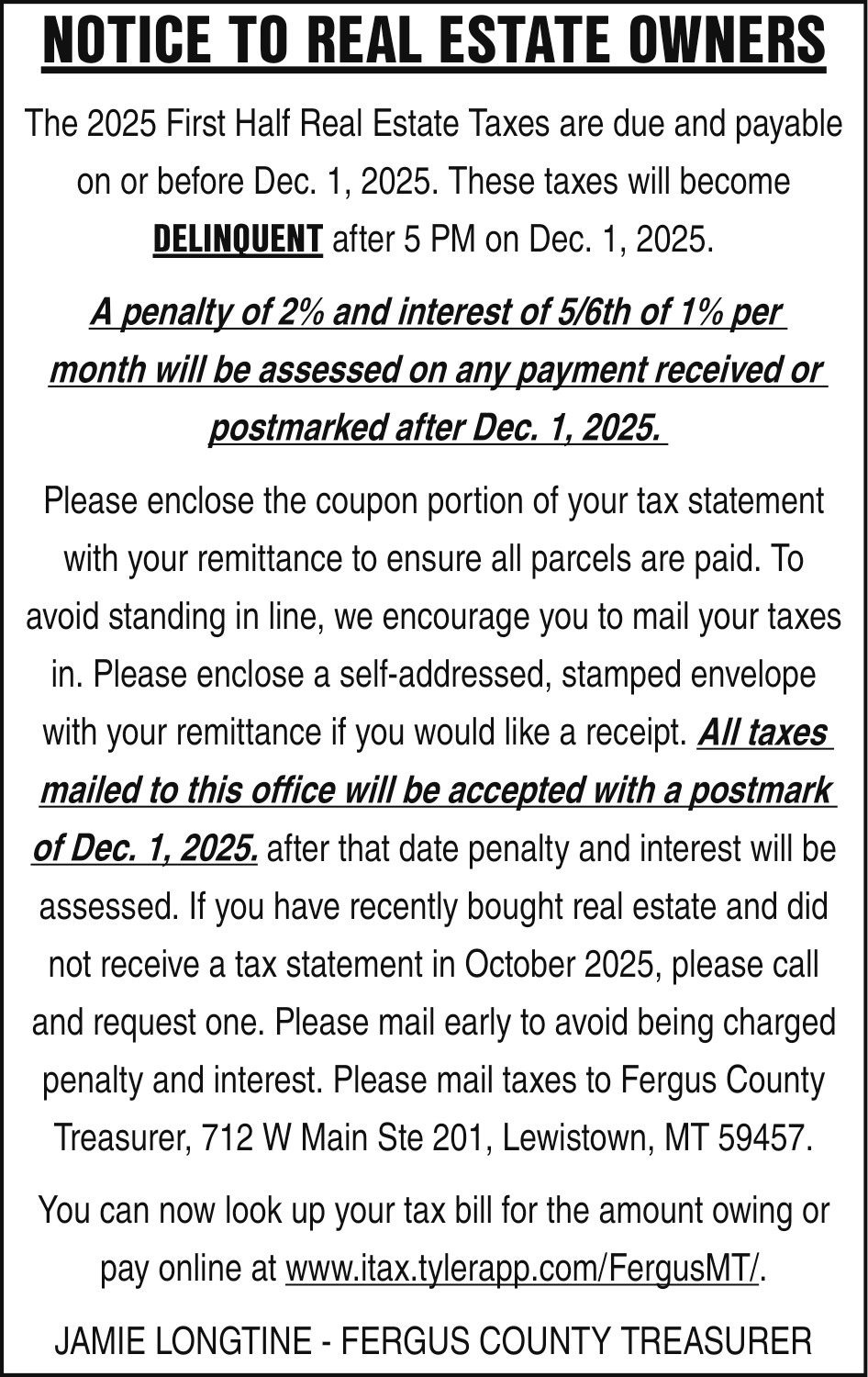 Nov 26, 2025. Fergus County Treasurer - Jamie Longtine Public Notice Ads from Lewistown News-Argus
