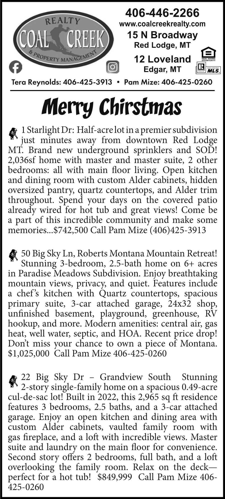 Dec 25, 2025. Coal Creek Realty & Property Management Real Estate Ads from The Carbon County News