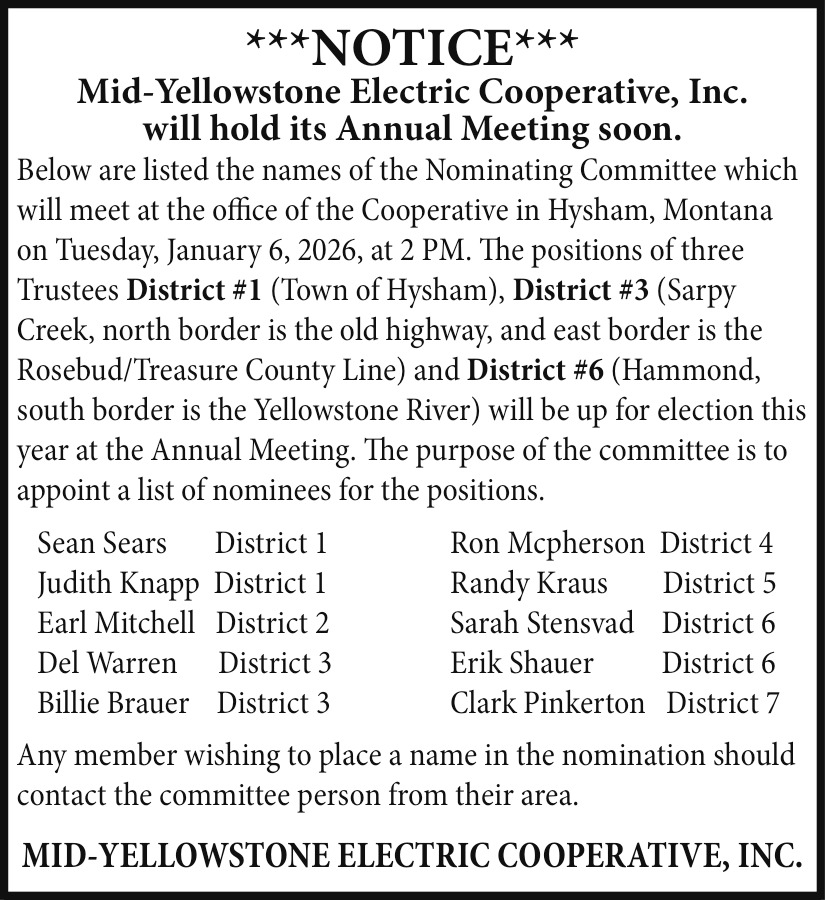 Dec 31, 2025. Mid-Yellowstone Electric Cooperative Annual Meeting (Jaunary 6, 2026) Events Ads from The Independent Press