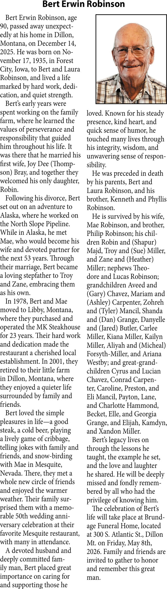 Dec 31, 2025. Obituaries Obituaries Ads from The Dillon Tribune