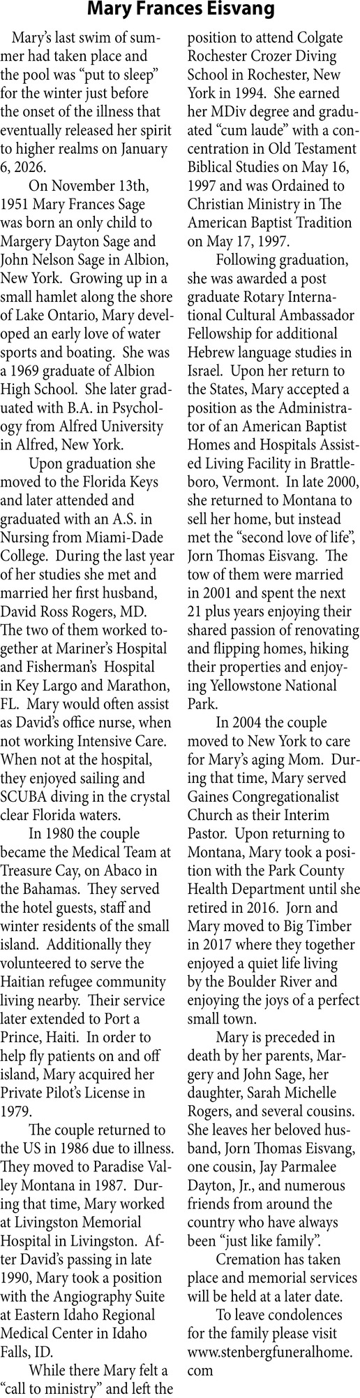 Jan 22, 2026. Obituaries Obituaries Ads from The Big Timber Pioneer