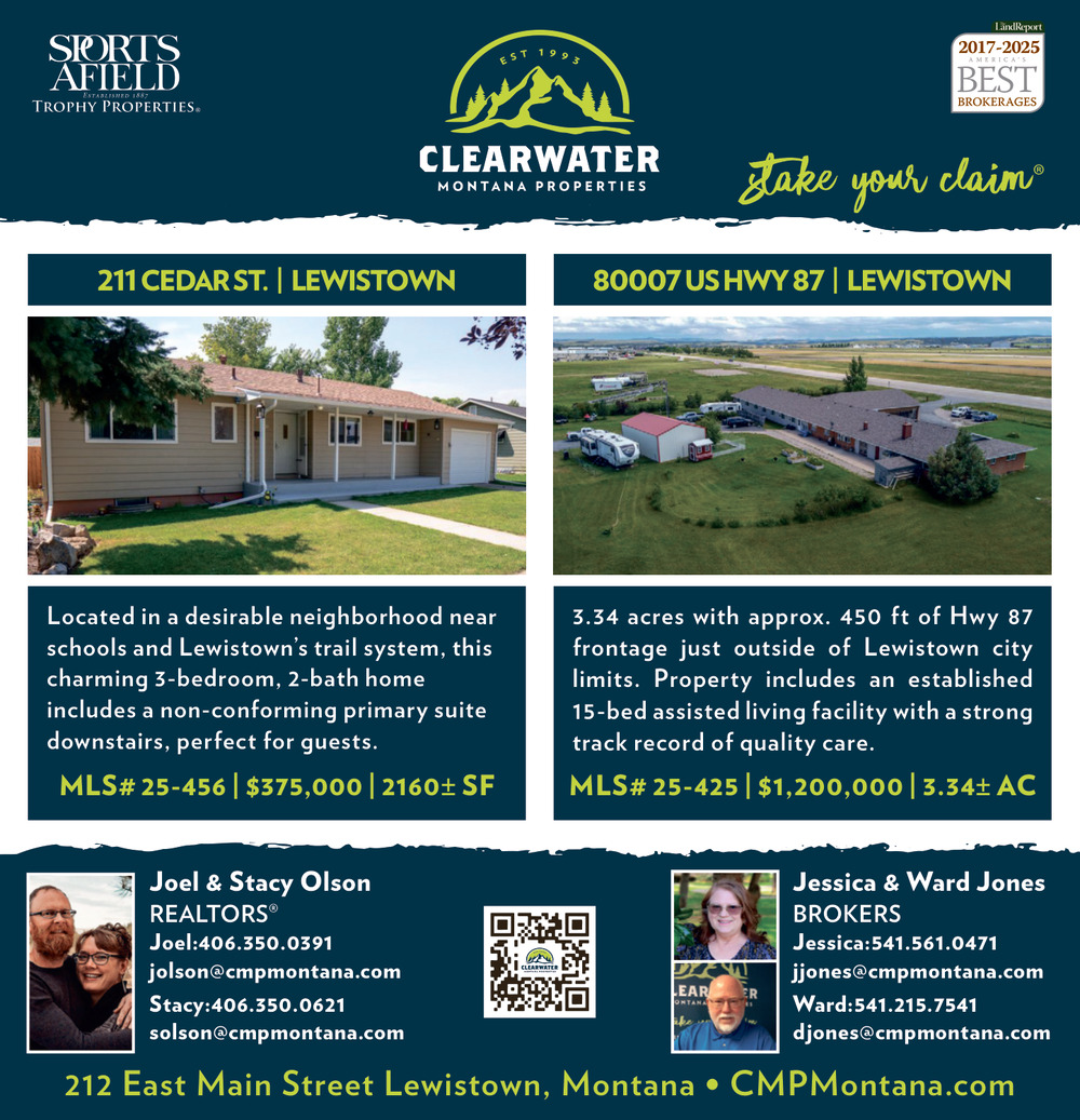 Jan 24, 2026. Clearwater Montana Properties - Joel & Stacy Olson / Jessica & Ward Jones Real Estate Ads from Lewistown News-Argus