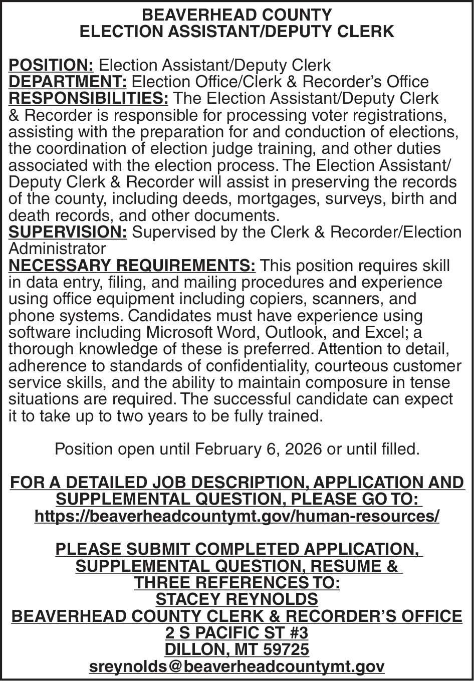 Jan 28, 2026. Beaverhead County Jobs Ads from The Dillon Tribune