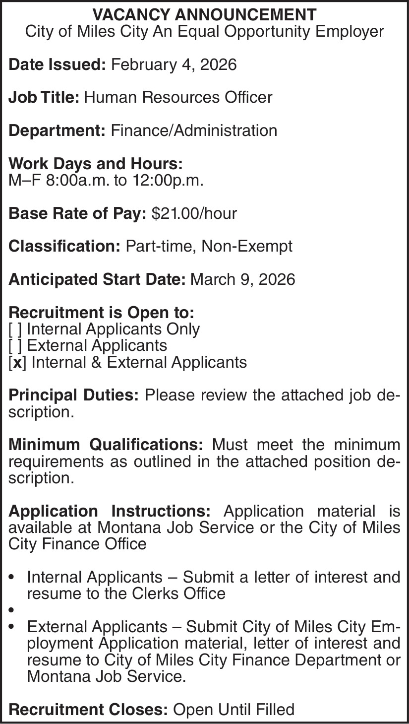 Feb 14, 2026. City of Miles Jobs Ads from The Miles City Star
