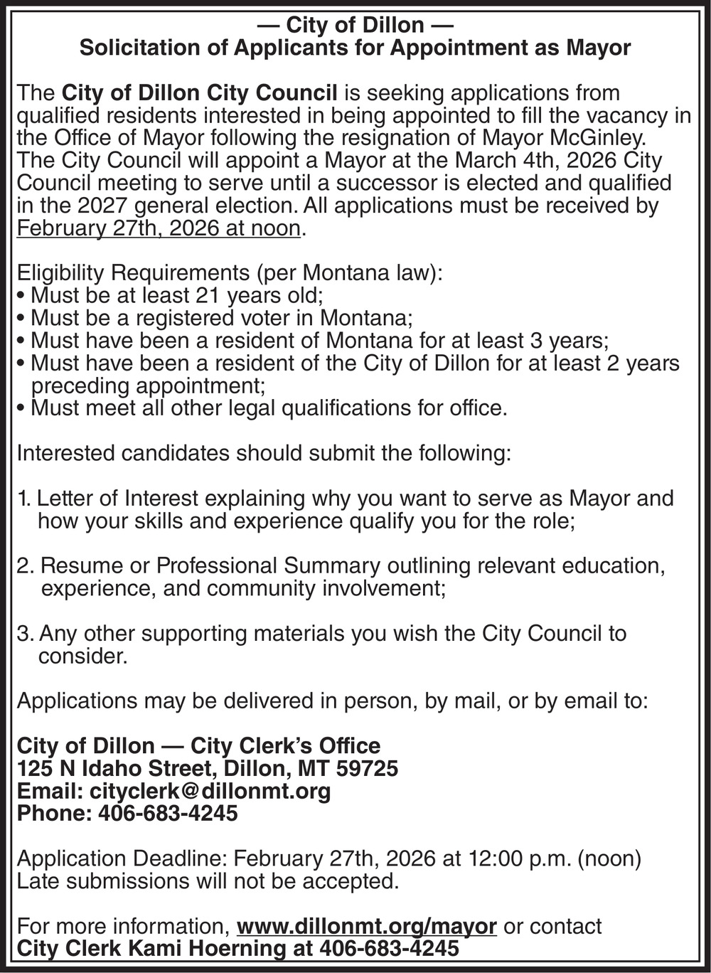 Feb 18, 2026. City of Dillon Public Notice Ads from The Dillon Tribune