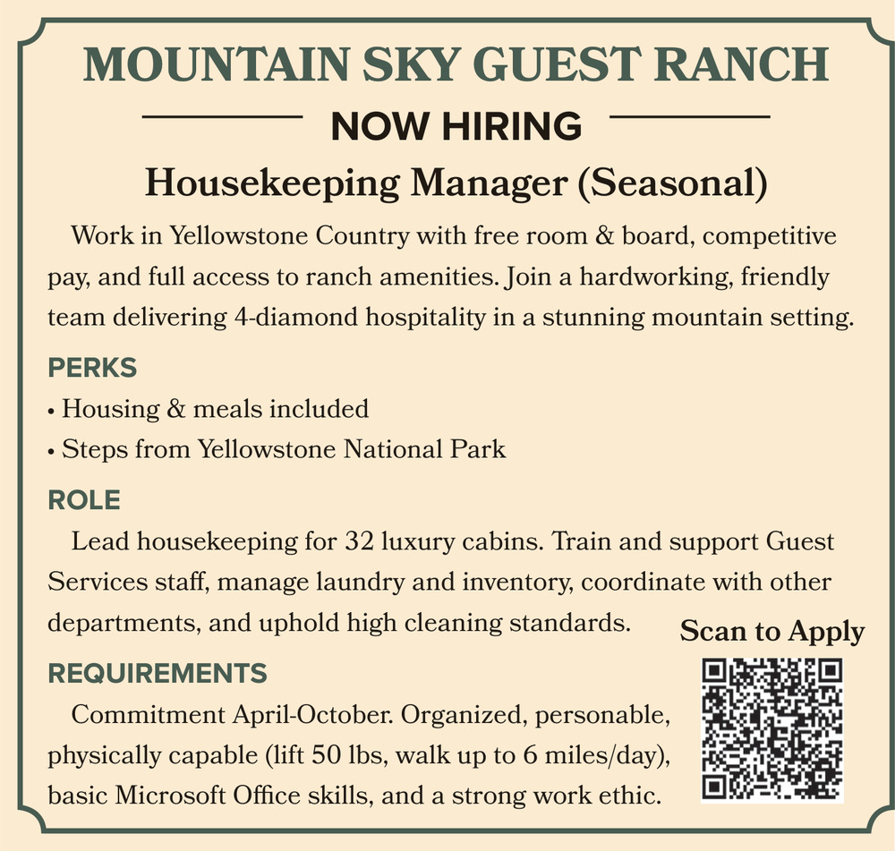 Mar 10, 2026. Mountain Sky Guest Ranch Jobs Ads from Livingston Enterprise