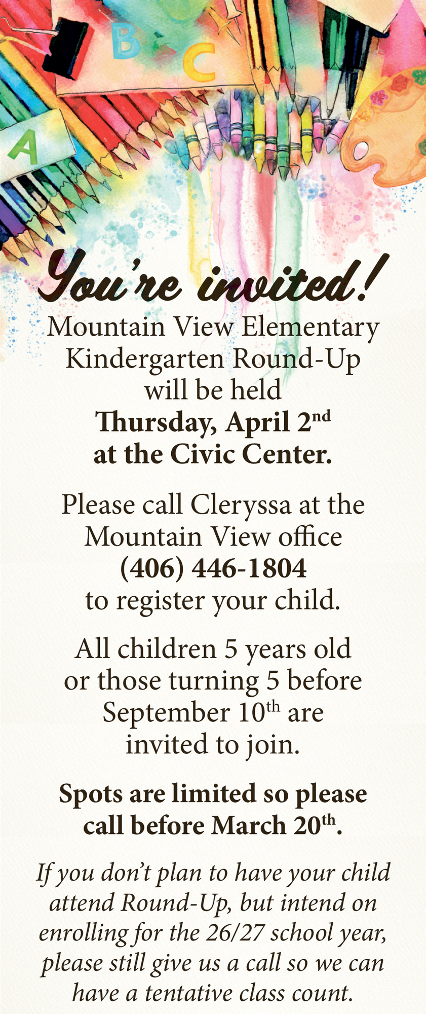 Ads for Mountain View Elementary Kindergarten Round-Up (April 2, 2026) in Montana