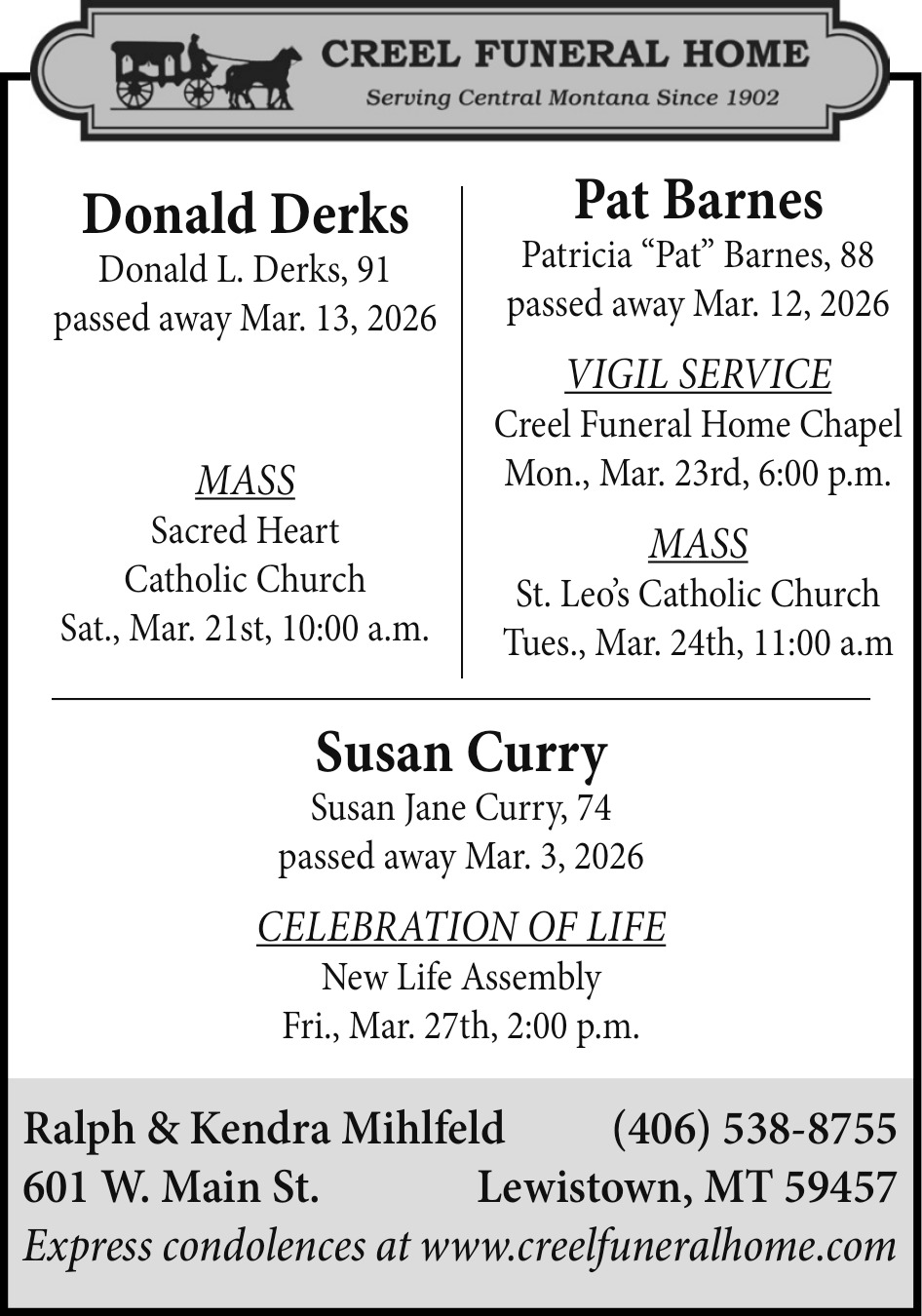 Mar 21, 2026. Creel Funeral Home Funeral Ads from Lewistown News-Argus