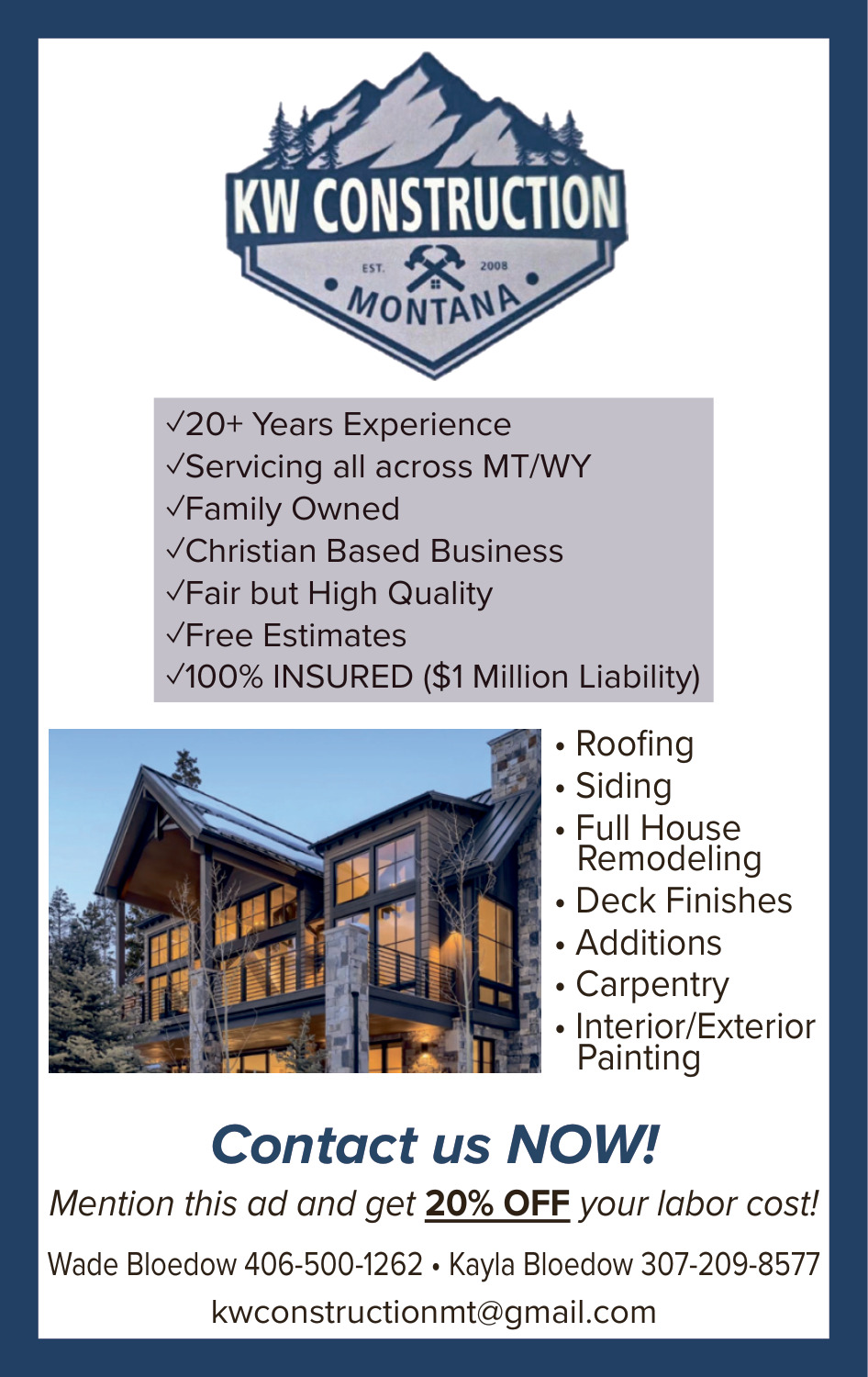 Ads for KW Construction Montana in Billings, MT