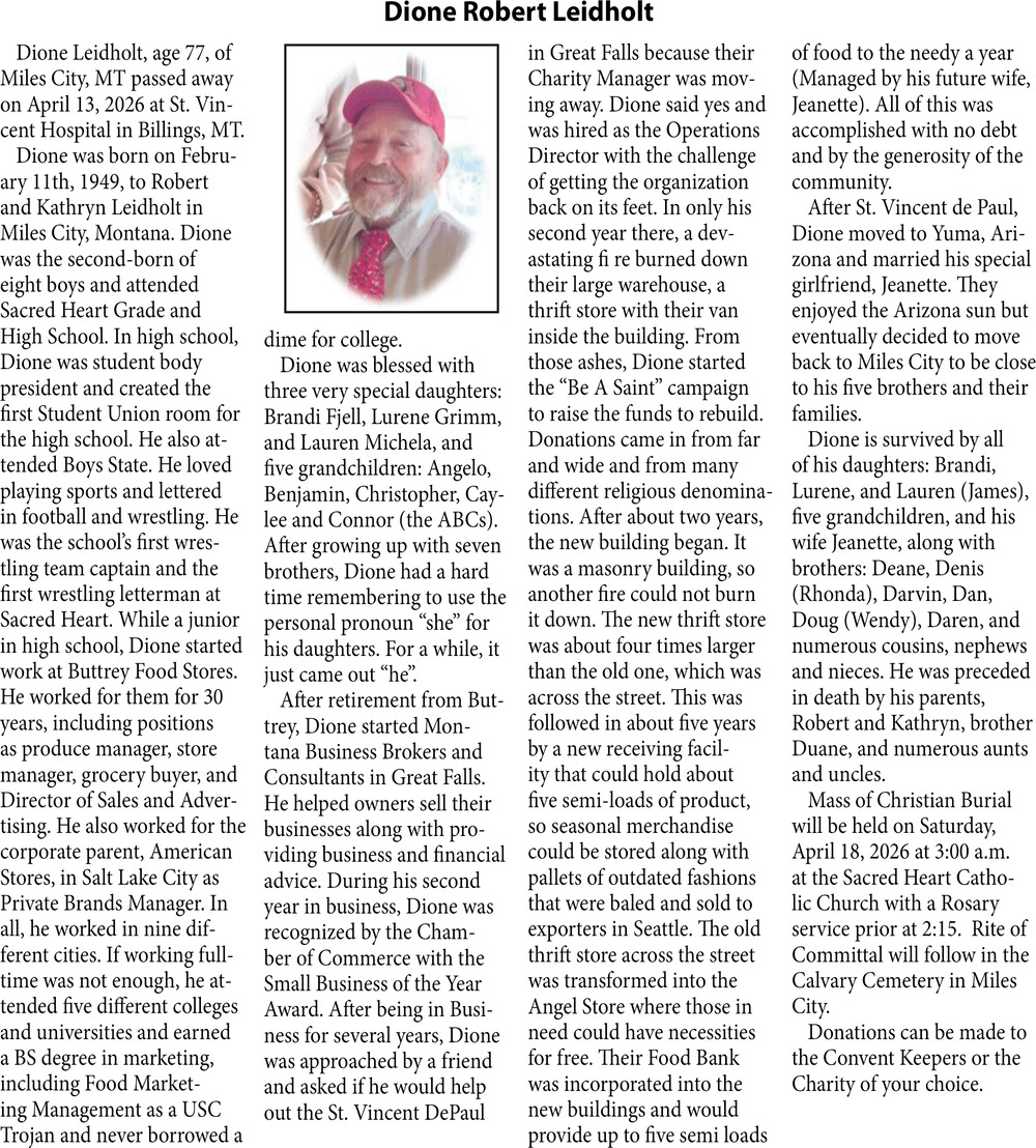 Apr 18, 2026. Obituaries Obituaries Ads from The Miles City Star