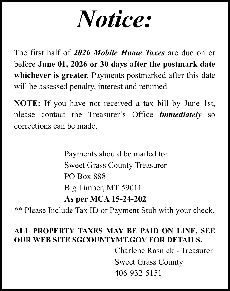 Apr 23, 2026. Charlene Rasnick - Sweet Grass County Public Notice Ads from The Big Timber Pioneer