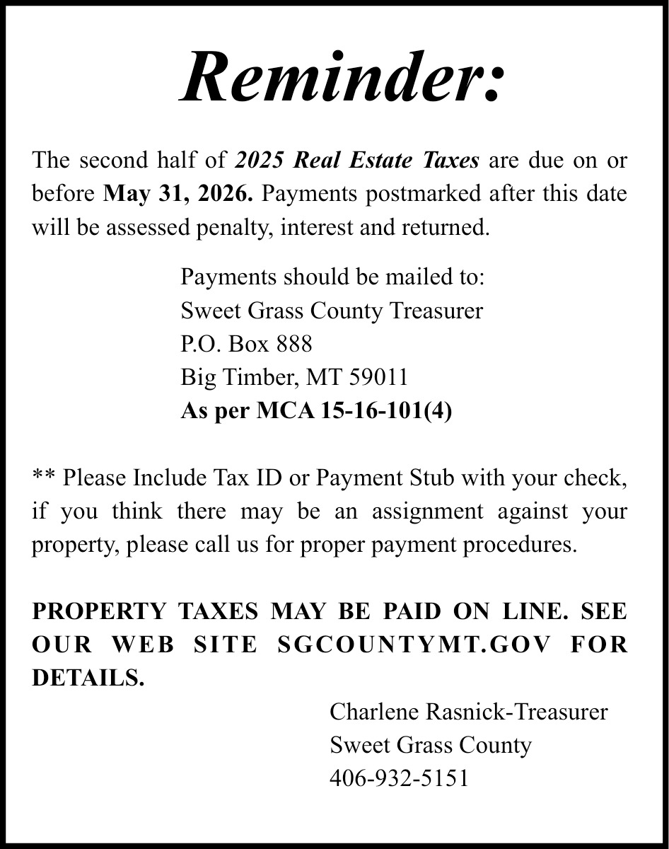 Apr 23, 2026. Charlene Rasnick - Sweet Grass County Public Notice Ads from The Big Timber Pioneer