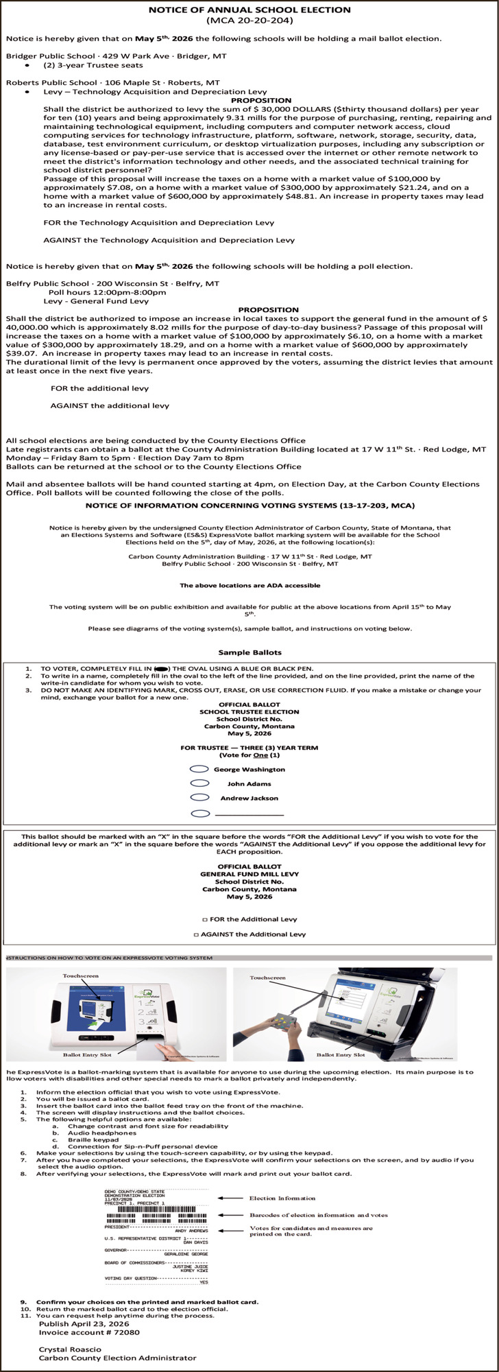Apr 23, 2026. Carbon County Election Administration Government Ads from The Carbon County News