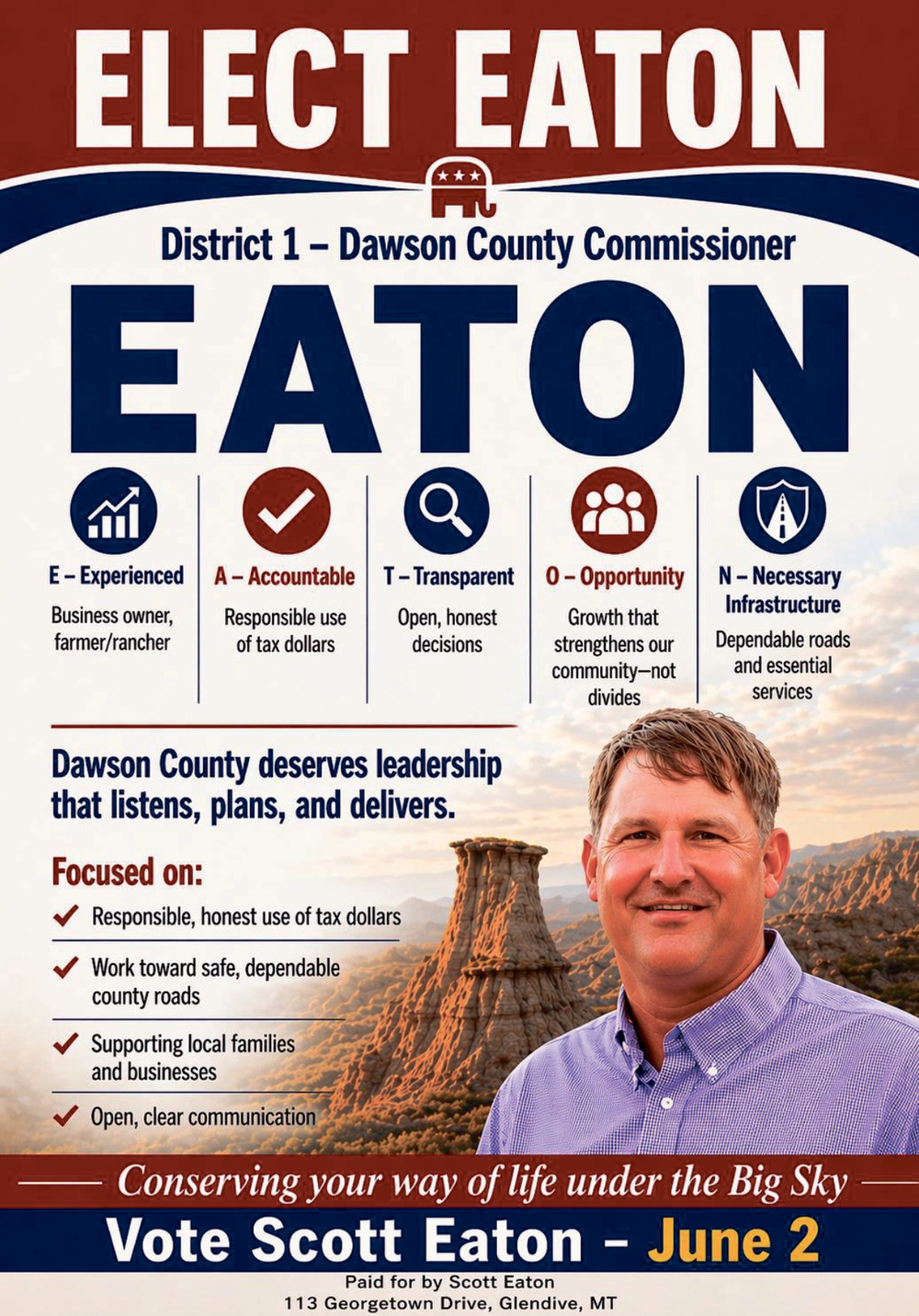 Apr 25, 2026. Scott Eaton for Dawson County Comissioner District 1 Government Ads from The Glendive Ranger-Review