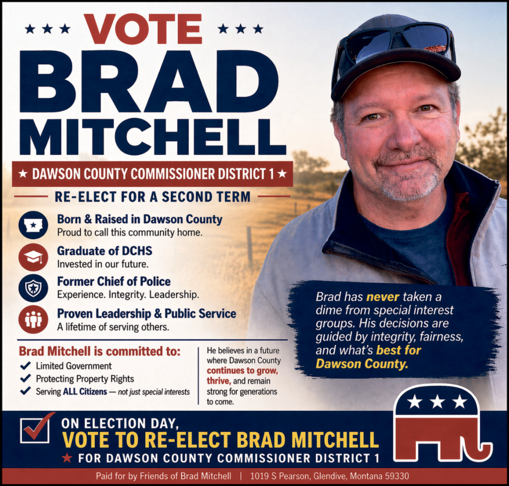 Apr 25, 2026. Brad Mitchell Dawson County Commissioner District 1 Government Ads from The Glendive Ranger-Review