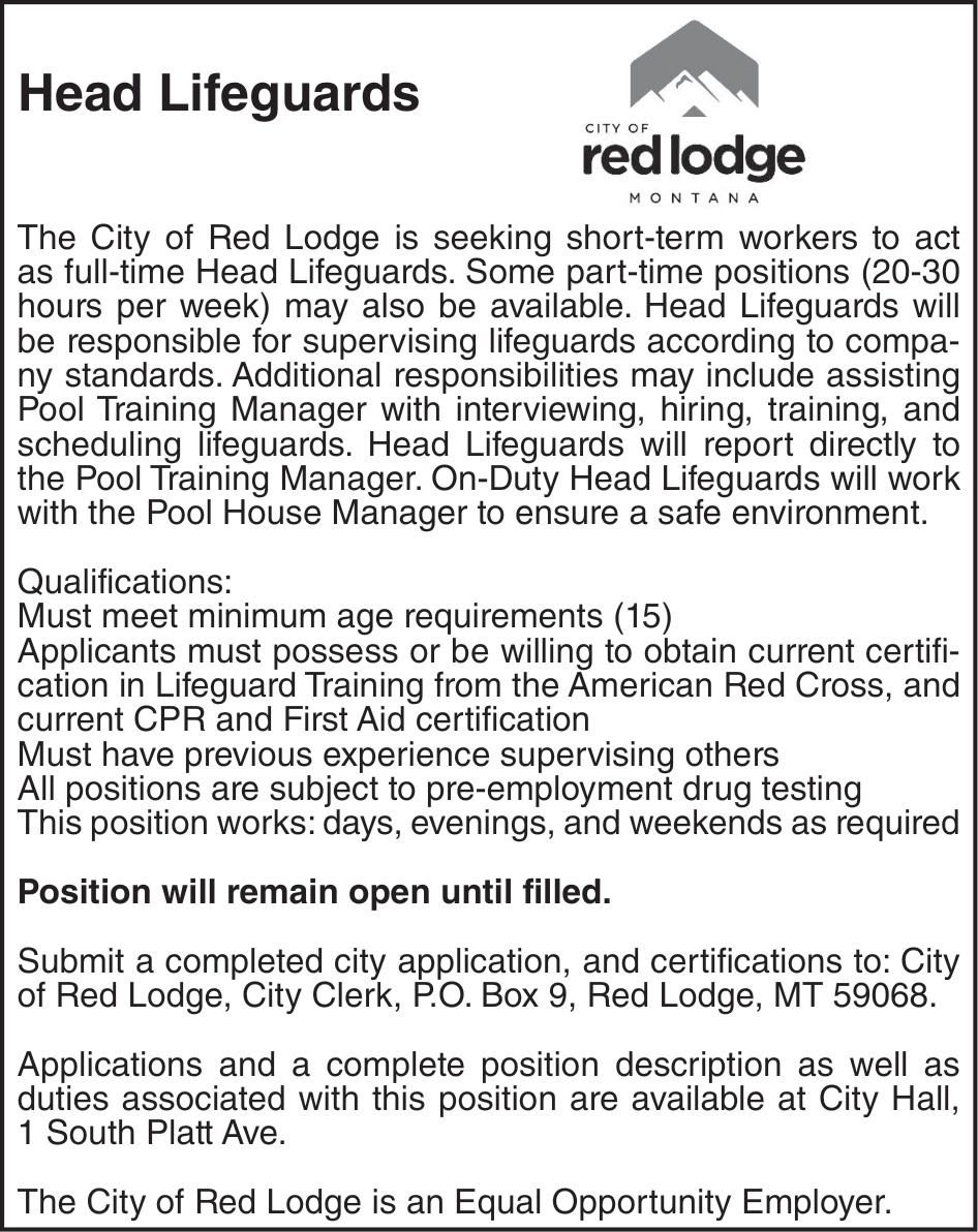 Apr 30, 2026. City of Red Lodge Jobs Ads from The Carbon County News