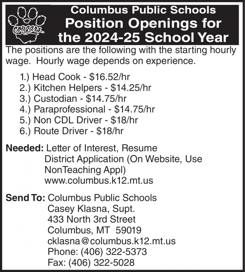 Jul 18, 2024. Columbus Public Schools Jobs Ads from The Stillwater County News